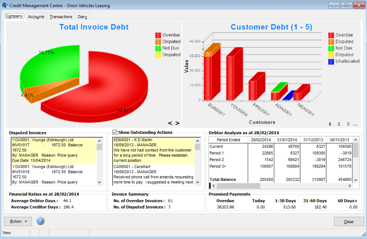 The Credit Management Centre provides credit controllers and those involved in debt management with a centralised, easy-to-use tool which consolidates all of the information needed for effective credit control. Easy-to-understand, real-time graphs display your overall financial status so you can quickly see what is owed, who owes it and how much money has been promised by customers. This gives you all the information you need to improve cashflow, reduce bad debt and improve the overall financial position of your business.